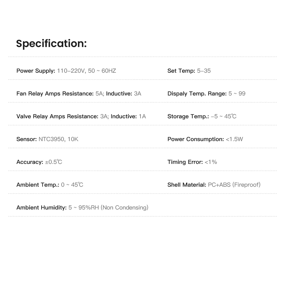 - Temperature Range: 5°C to 35°C setpoint, 5°C to 99°C display
